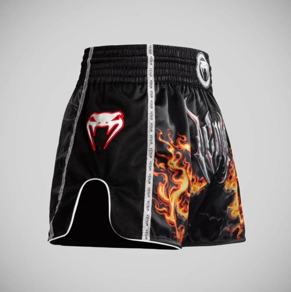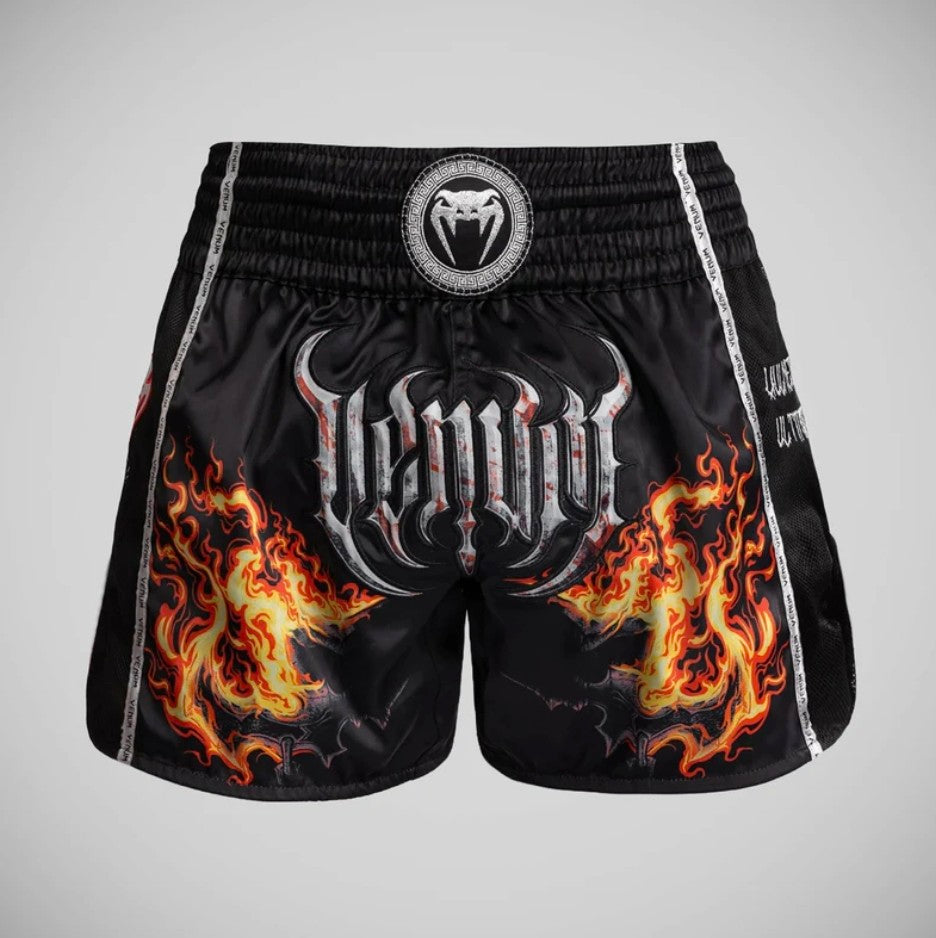 The Venum Gladiator 5.0 Muay Thai Shorts are perfect for fighters looking to dominate the ring. With striking neon orange and black graphics, along with the iconic Venum logo and Roman-inspired designs, these shorts truly embody discipline and courage.